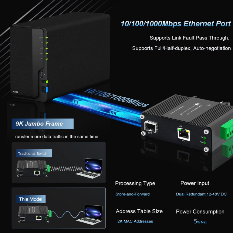 It supports 10/100/1000BASE-T ↔ 1000BASE-X bidirectional transmission, and the fiber port is backward compatible with 100M bandwidth to meet diverse network deployment needs.